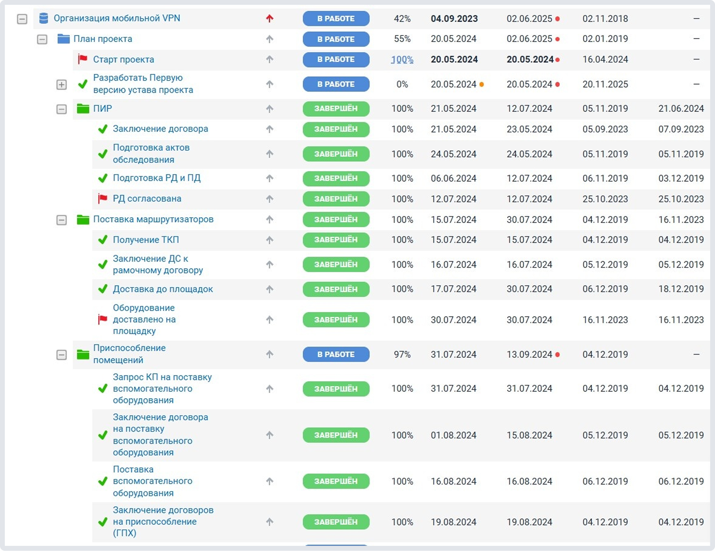 - Изменение статуса, срока или бюджета на нижнем уровне автоматически обновляет картину на верхнем